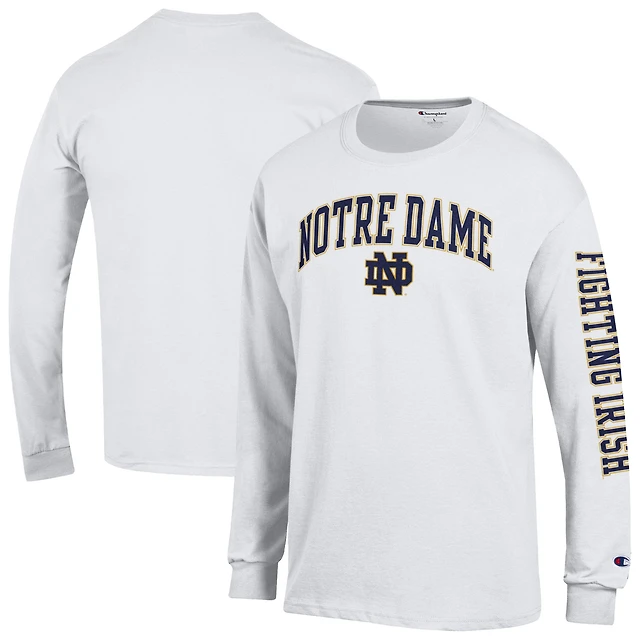 T-shirt à manches longues blanc Champion Notre Dame Fighting Irish pour homme, logo Arch Over, 2 coups