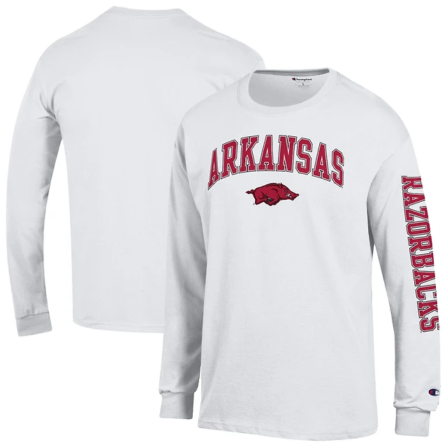 T-shirt à manches longues blanc pour homme, Champion Arkansas Razorbacks, logo Arch Over, 2 coups