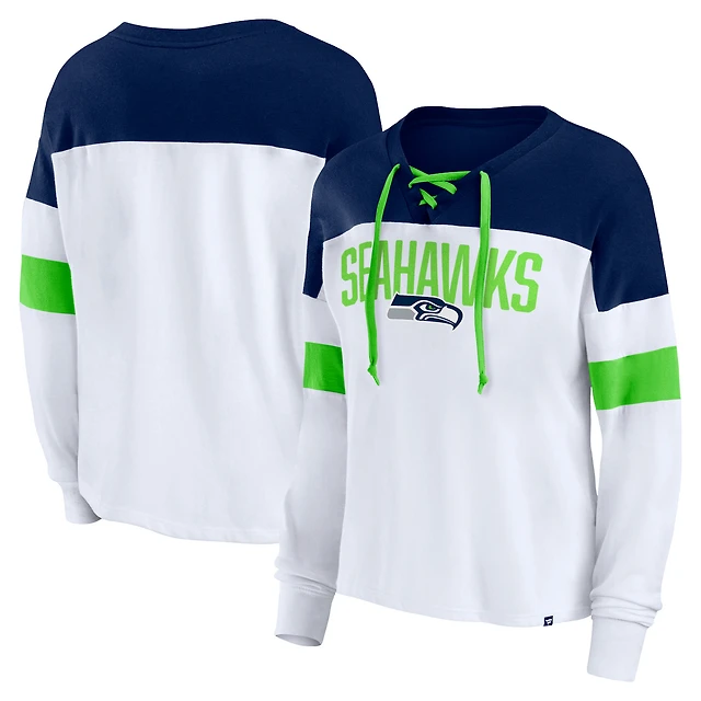 T-shirt à manches longues et col en V Fanatics pour femmes, blanc/bleu marine universitaire, Seattle Seahawks Even Match