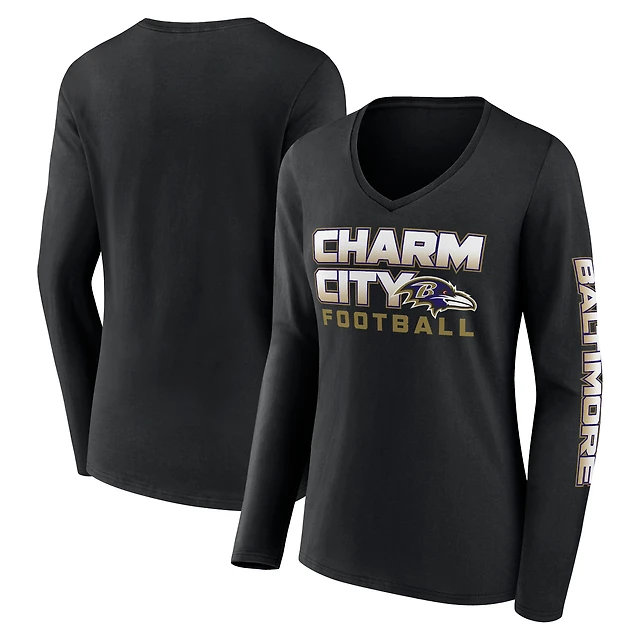 T-shirt à manches longues et col en V pour femme Fanatics Black Baltimore Ravens Hometown Sweep