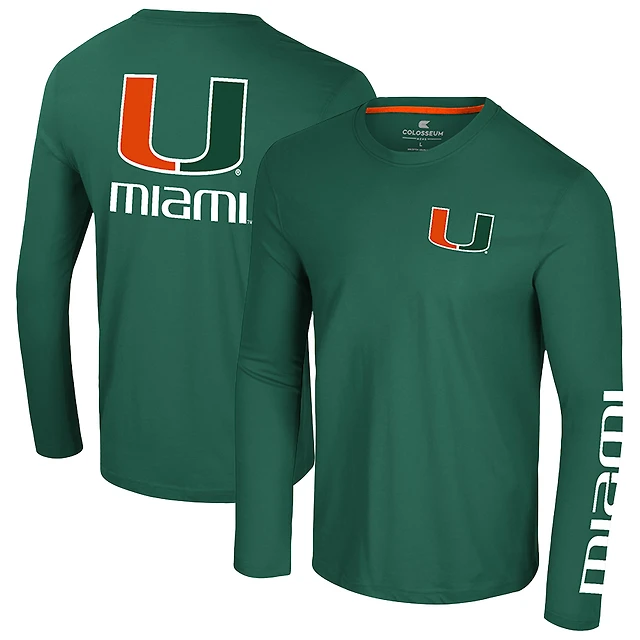T-shirt à manches longues pour homme, vert Colosseum, logo des Hurricanes de Miami, Lockup 3-Hit Active Blend