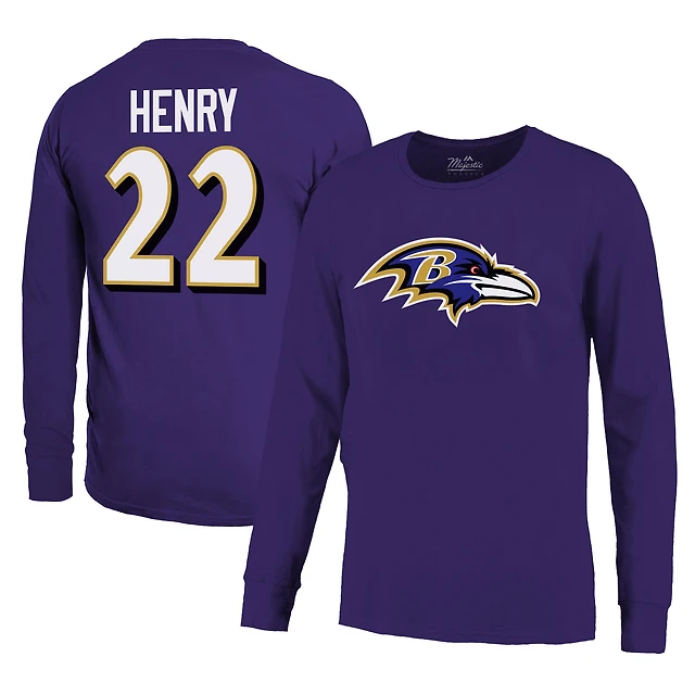 T-shirt à manches longues pour hommes Majestic Threads Derrick Henry violet Baltimore Ravens nom et numéro