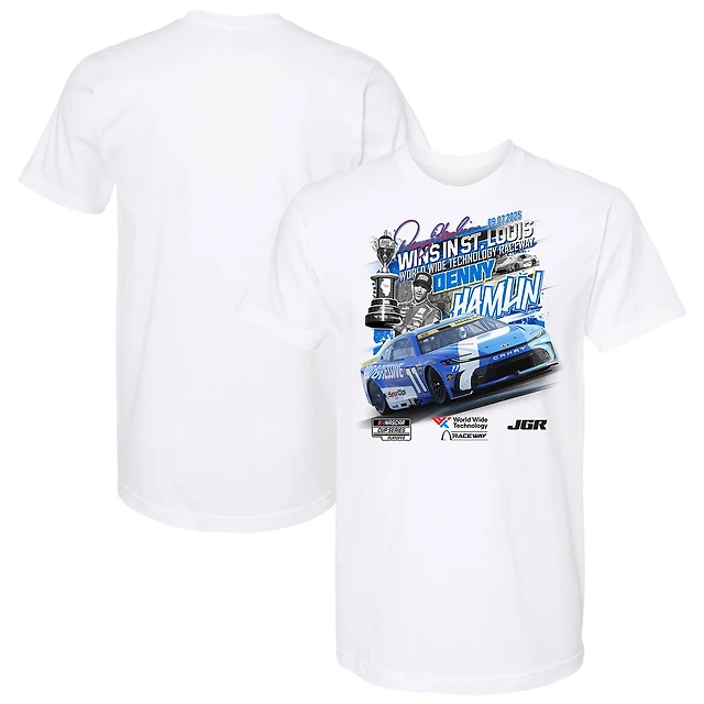 T-shirt blanc à damier pour homme, Denny Hamlin, vainqueur de la course Enjoy Illinois 300 2025