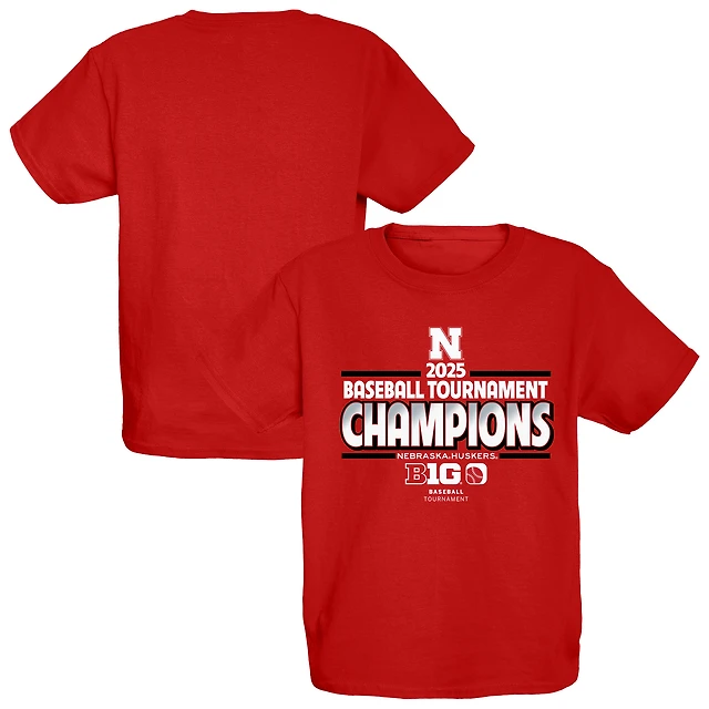 T-shirt bleu 84 Scarlet Nebraska Huskers pour jeunes, champions du tournoi de la conférence baseball Big Ten 2025, vestiaire
