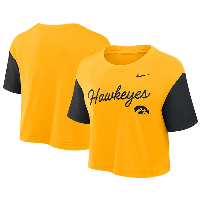 T-shirt court Nike Iowa Hawkeyes Dri-FIT à blocs de couleurs pour femme, couleur or/noir