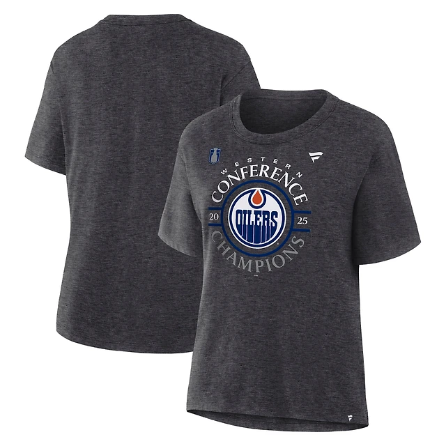T-shirt Fanatics Heather Charcoal pour femmes, champion de la Conférence Ouest 2025 des Oilers d'Edmonton, vestiaire