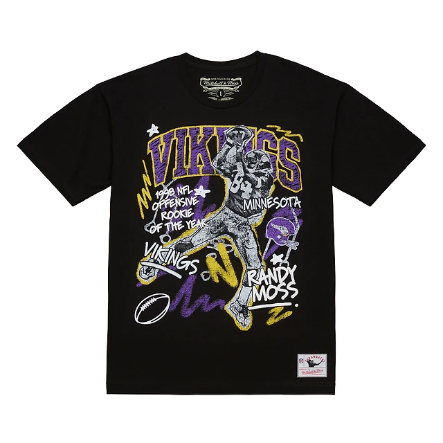 T-shirt graphique noir Mitchell & Ness Randy Moss pour homme, joueur des Vikings du Minnesota, avec inscription « Cheat Up »