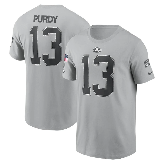 T-shirt Nike Brock Purdy gris pour homme San Francisco 49ers 2024 Salute To Service avec nom et numéro