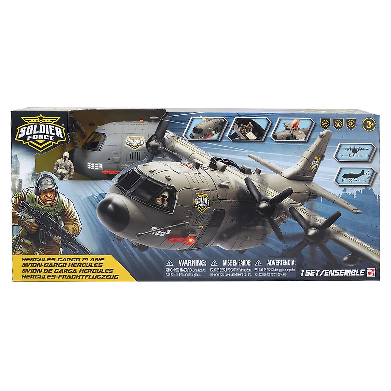 R Exclusive, only available at Toys R Us Canada. Patrol the skies with the ultimate cargo carrier! The Hercules is one of the largest cargo planes in existence, making this armed aircraft perfect for any mission. The two poseable action figures fit inside the aircraft - just open the door to place inside. There's even room to set up their war room and strategy table. Press the button for lights and battle sounds, spin the propellers, and grab the carry handle to make the plane soar through the air. Free-wheeling plane can be rolled along. Get ready for takeoff... and for taking the battle to the skies!