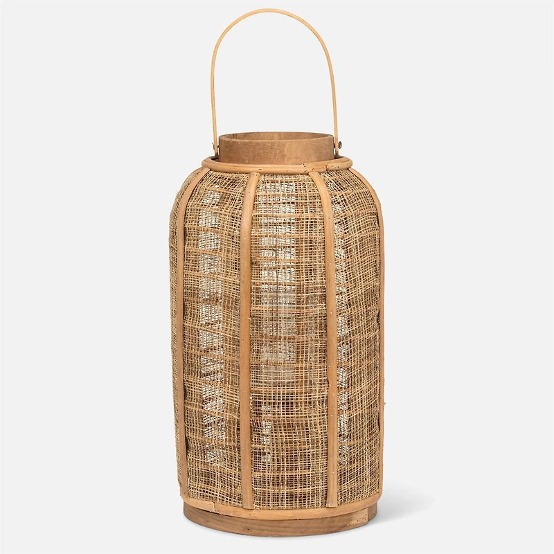 With its tall form and natural textures, this lantern becomes an anchor point in your decor. Add a candle to complete the look.Linen/Fabric wrapped over bamboo wood frames. This lantern style includes a 3" D x 4"H glass votive.