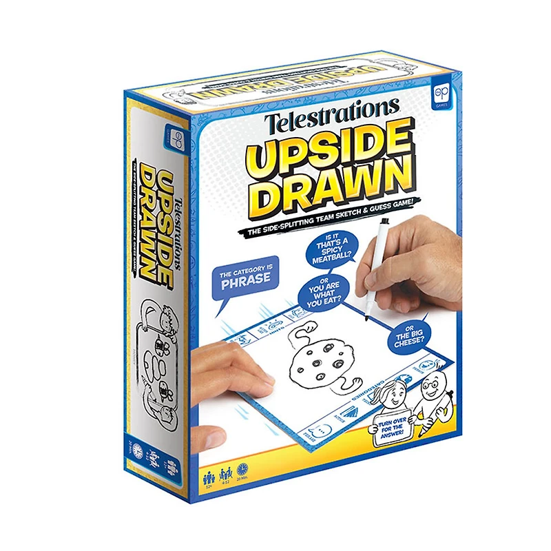It's Telestrations, but Upside Down! This take on the award winning Telestrations game gives a whole new meaning to laugh out loud miscommunication. Telestrations: Upside Drawn puts a teamwork spin on "The Telephone Game Sketched Out" by putting the pen in one person's hand, and control of the board in another's! Only through "Up" or "Down" directives can the team put the pen and board together to guess the clue first! The team to reach 20 points wins!