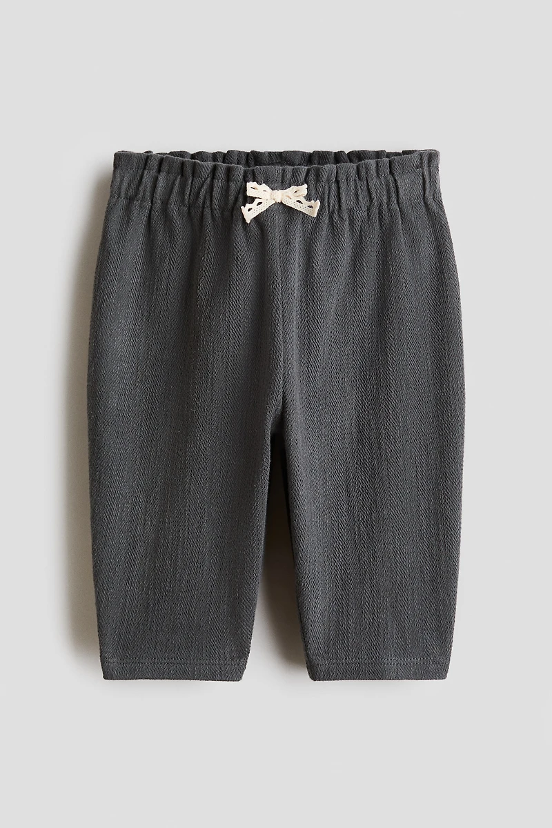 Pants in soft, textured cotton jersey. Adjustable, elasticized waistband with a small lace bow at front.