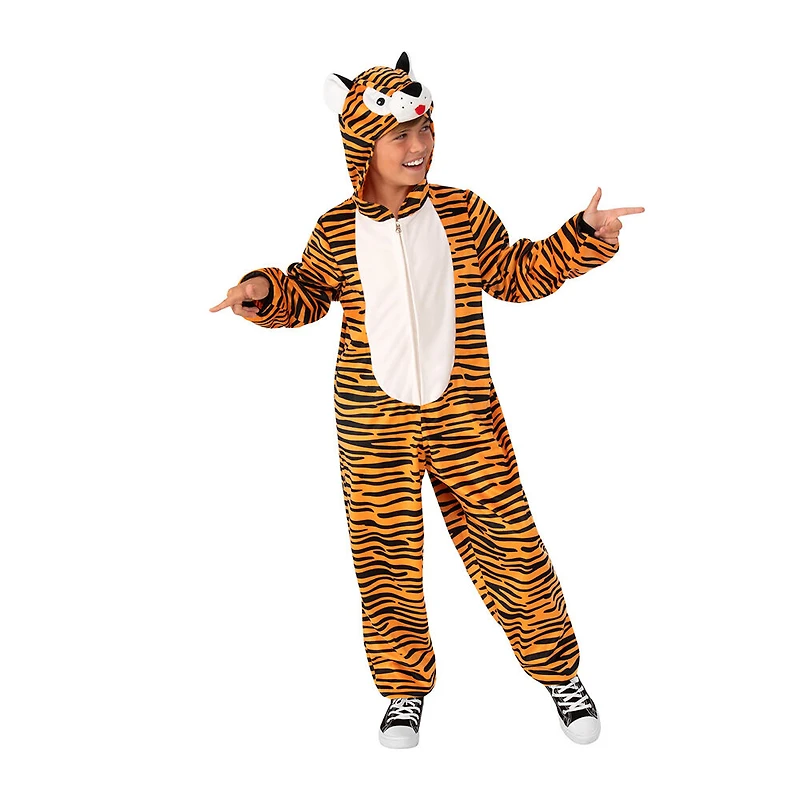 This Child Tiger Halloween Costume jumpsuit is made from a soft and comfortable plush fabric. You will feel like a King in this cool costume. Beautiful detailing on the hood. Front zipper allows for easy in and out. The sleeves and pants are finished with rib trim. This onesie is easy care machine washable and hang to dry. Not intended for sleepwear. Great for Halloween or theme parties. This item is quality tested and safety approved. Rubies has been delivering great costumes since 1951.