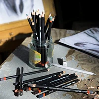 The Derwent charcoal pencils combine the quality of charcoal with a light touch of colour. They are easy to handle, are water soluble and allow creating a wide range of effects. Many shades of charcoals and 3 basic gradations of charcoal pencils (light, medium and dark) for sale. Line width: 0.4 mm
