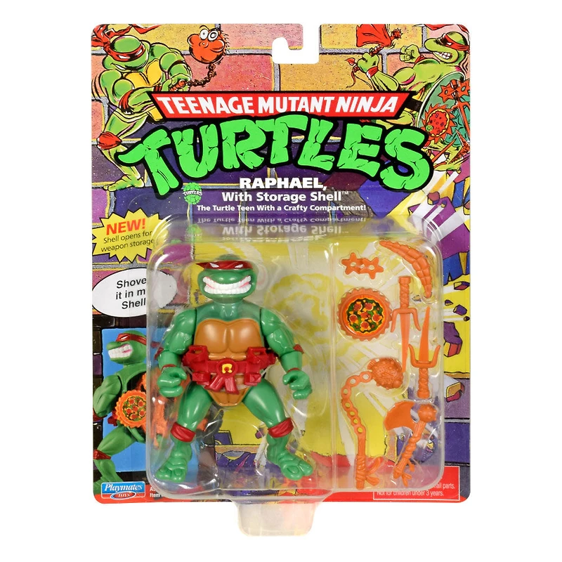 Master of the back attack, Raph's ready to blast those sewer soaked Foot fools with everything packed in his shell. This tricky Turtle teen loves to fake out the Foot into thinking he's empty-handed - but we all know better than that! With just a flick of his shell, he's got everything a Foot fighting hero needs; a manta axe for hacking hoods in half; a blowfish mace to knock out the Clan's transistorized teeth; and a ninja-rang for boomer-anging bad boys. But that's not all! Raph's super storage shell still has room for more secret sewer stuff, like ninja stars and a pizza disc! So don't worry when Raph's all aloneand surrounded by a hoard of henchmen, 'cause his secret stash of Foot flipping weapons is always right behind him.