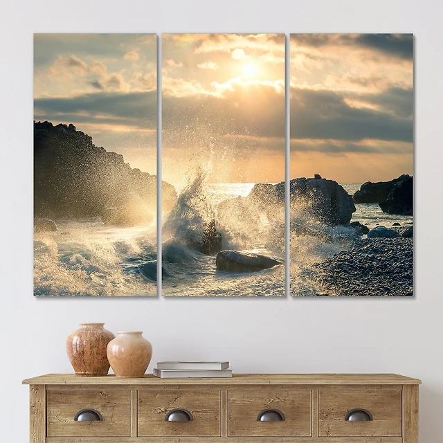 Toile imprimée « Big Wave Hit the Rock at Beach