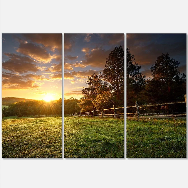 Fenced Ranch at Sunrise Canvas Wall Art - 3 Panels