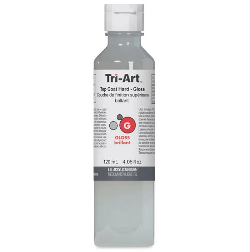 Tri-Art's Hard Top Coat finishing medium provides artists with a very hard, scratch resistant, yet semi-flexible top coat for application onto paintings, sculpture and crafts. This durable water-based product dries to a glass-clear and non-tacky finish. It is washable, scratch resistant and virtually non-yellowing. Top Coat is self-leveling and can be brushed, poured, or sprayed to produce a thin protective finish. This product remains semi-flexible even in multiple layers.Finish: GlossMade in Canada