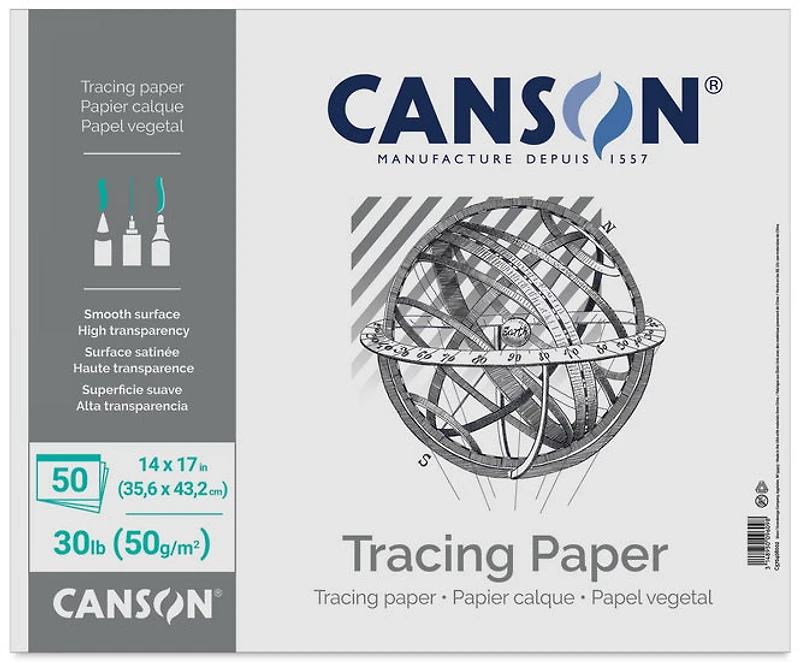 Canson Tracing Paper Pads are designed to offer superior quality and great versatility, meeting the needs of both professionals and creative enthusiasts in technical drawing and graphic arts. Featuring optimal transparency, the paper provides a clear view of drawings for precise layering work. Highly durable, it also resists repeated handling and erasing without tearing. Its smooth surface is ideal for clean, snag-free tracing, facilitating the use of technical pens or pencils. Suitable for a variety of mediums, including ink and graphite.