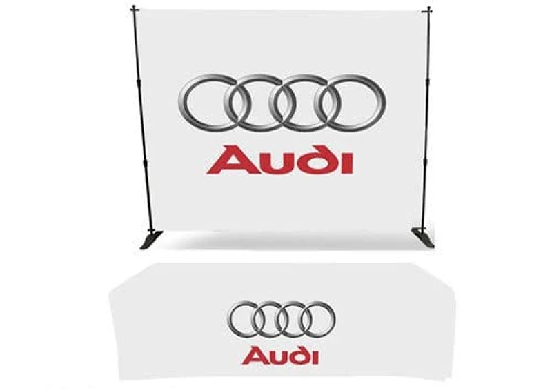 Package includes hardware with soft case and graphics and a sublimated tablecloth. Graphics can be whatever you want, step and repeat, Photo images, full colors logo (s).