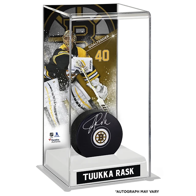 Tuukka Rask Boston Bruins Autographed Puck with Deluxe Tall Hockey Puck Case