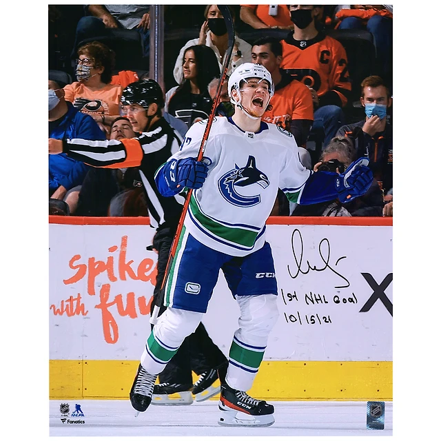 Vasily Podkolzin Vancouver Canucks Autographed 16" x 20" White Skating Photograph with "1st NHL Goal 10/15/21" Inscription