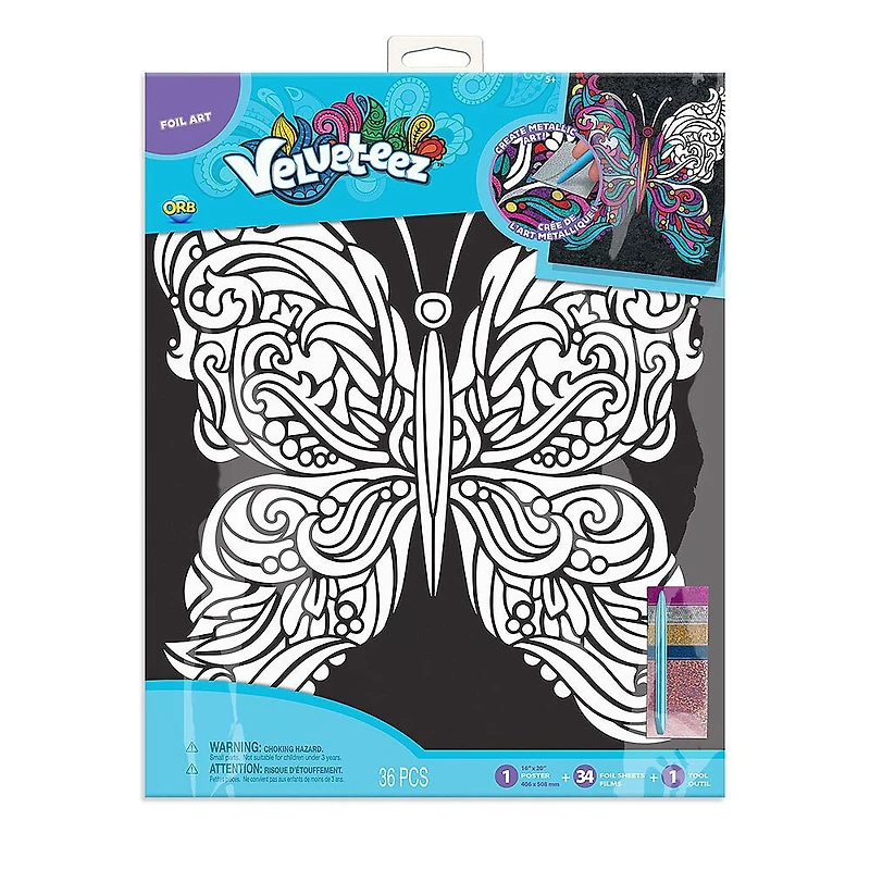 The Velveteez Foil Art collection creates metallic masterpieces in dazzling designs. Create a beautiful Butterfly by laying foil pieces onto the blank spaces and peeling back. Each piece of Foil leaves behind a sparkling metallic color. Get ready for mess free fun, with the Velveteezz Foil Art series.