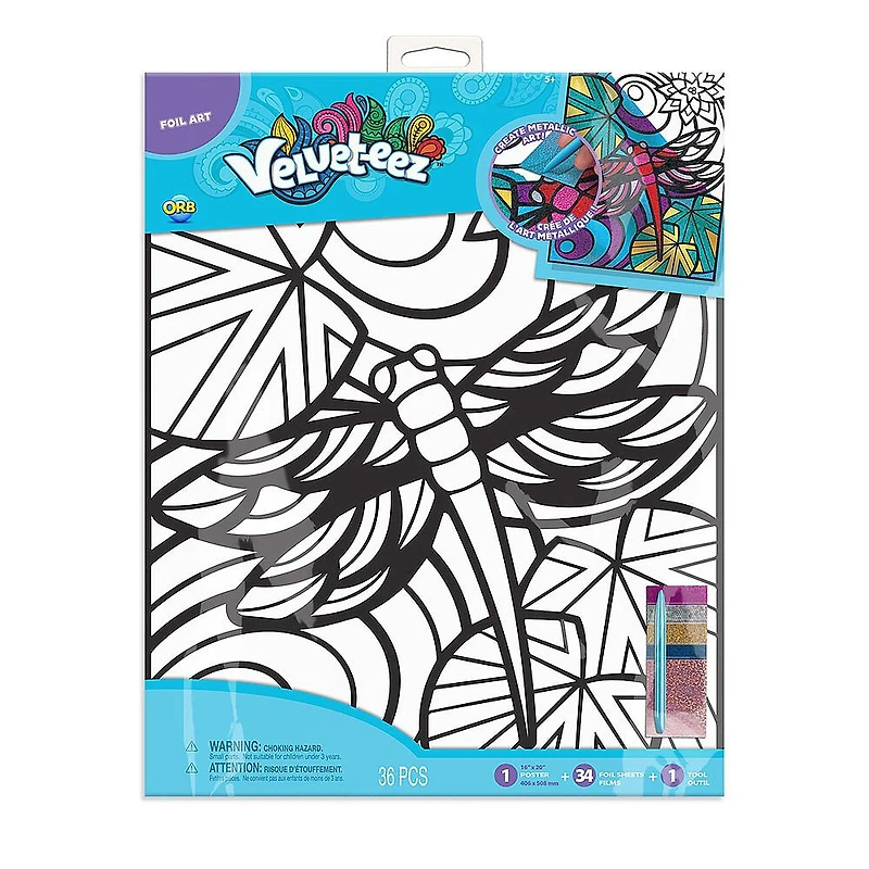 The Velveteez Foil Art collection creates metallic masterpieces in dazzling designs. Create a fluttering Dragonfly by laying foil pieces onto the blank spaces and peeling back. Each piece of Foil leaves behind a sparkling metallic color. Get ready for mess free fun, with the Velveteezz Foil Art series.