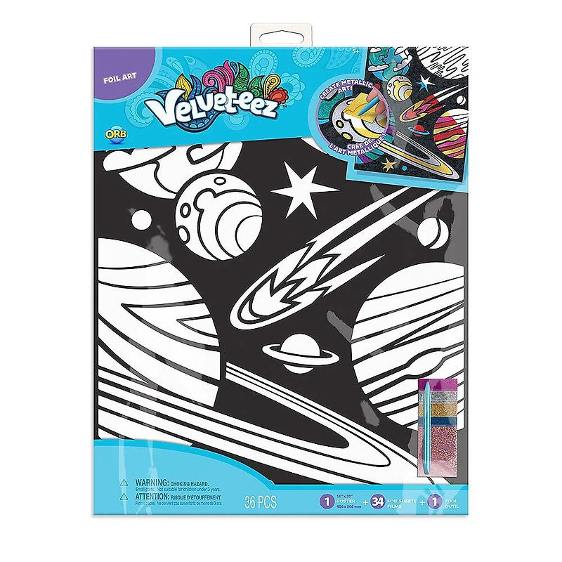 The Velveteez Foil Art collection creates metallic masterpieces in dazzling designs. Create a Space scene by laying foil pieces onto the blank spaces and peeling back. Each piece of Foil leaves behind a sparkling metallic color. Get ready for mess free fun, with the Velveteezz Foil Art series.