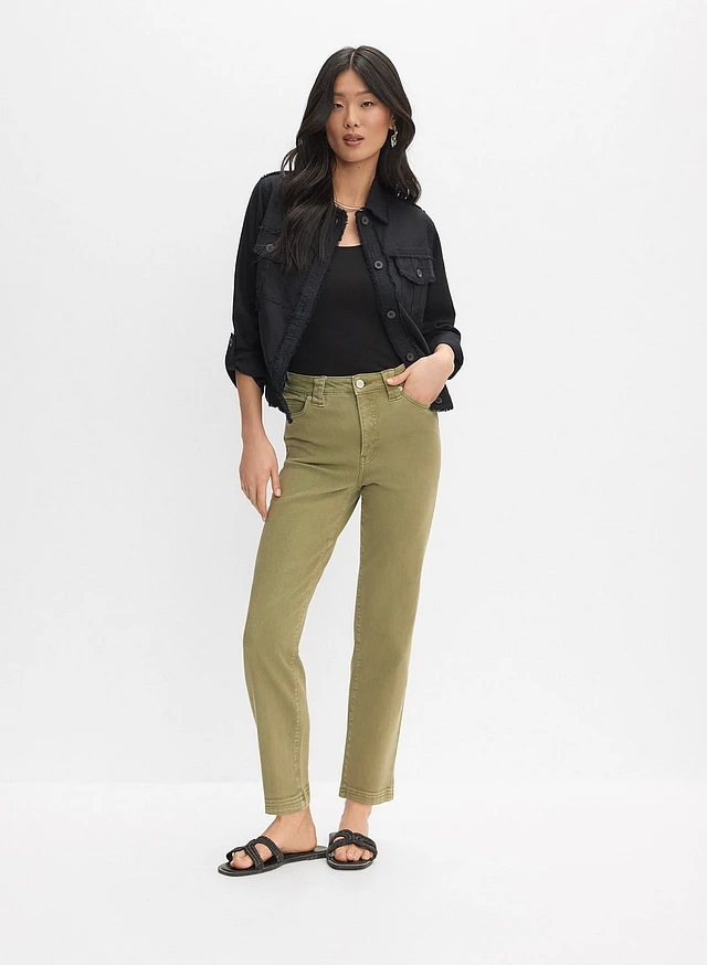Veste à bordures effilochées et jean à jambe droite