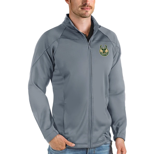 Veste de golf zippée intégrale Antigua Charcoal Milwaukee Bucks Links pour homme