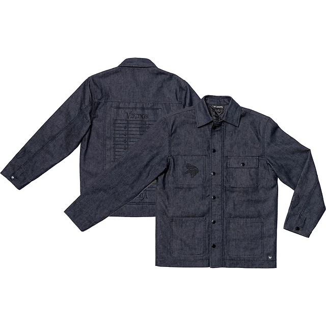 Veste en jean unisexe à boutons-pression de la collection internationale Vikings du Minnesota The Wild Collective, conçue par Leah et Chelsea