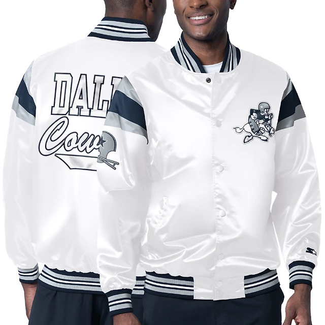 Veste universitaire à bouton-pression en satin Starter White Dallas Cowboys pour hommes
