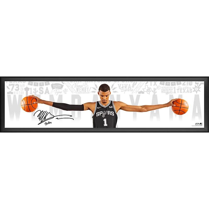 Celebrate the arrival of a generational talent in San Antonio with this Victor Wembanyama autographed and framed 84" x 20" Wingspan Photograph. This stunning, limited-edition image captures his remarkable eight-foot wingspan, a testament to his exceptional physical attributes that have captivated the basketball world. A distinct signature from Wemby along with a "The Alien" inscription, which gives focus to his otherworldly talent and potential, adds a personal touch from the 2023 NBA Rookie of the Year.