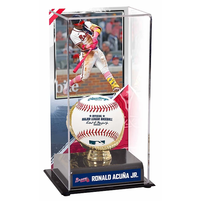Vitrine de présentation des gants dorés des Braves d'Atlanta de Ronald Acuna Jr. avec image