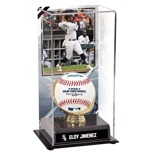 Vitrine de présentation des gants dorés des Chicago White Sox d'Eloy Jimenez avec image