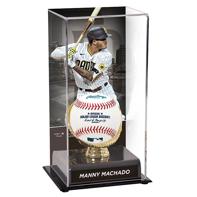 Vitrine de présentation des gants dorés des Padres de San Diego de Manny Machado avec image de frappeur