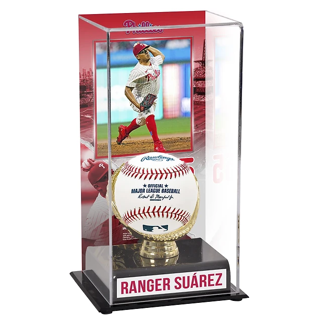 Vitrine de présentation des gants dorés des Philadelphia Phillies de Ranger Suarez avec image