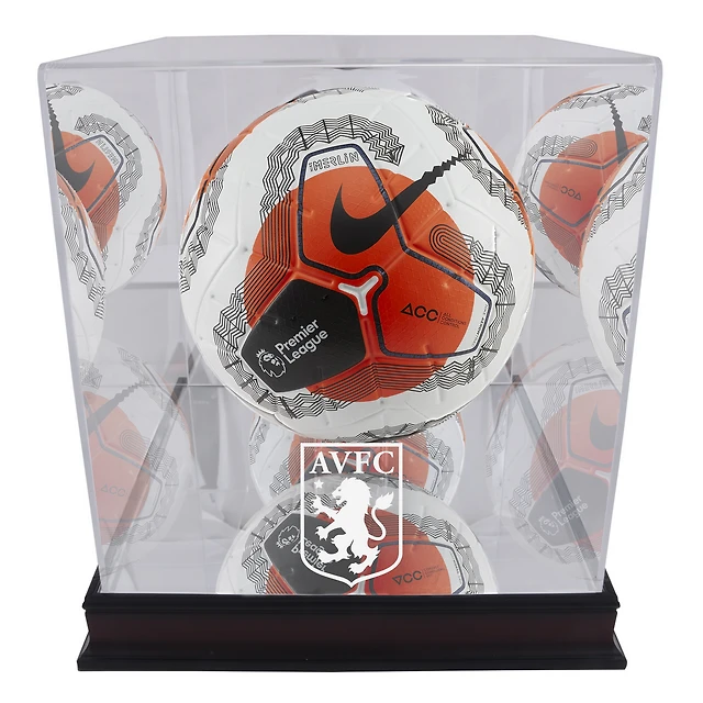 Vitrine de présentation du ballon de football avec logo de l'équipe Aston Villa en acajou