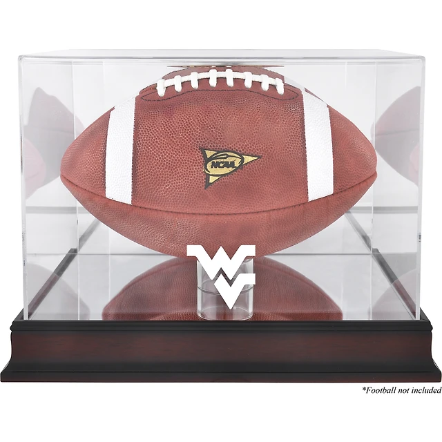 Vitrine de présentation du logo de football des West Virginia Mountaineers avec base en acajou et dos en miroir