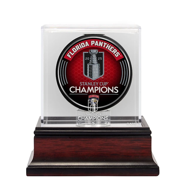 Vitrine de présentation du logo de la rondelle de hockey en acajou des Panthers de la Floride, champions de la Coupe Stanley 2025