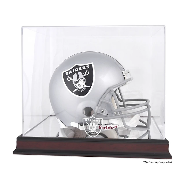 Vitrine de présentation du logo du casque des Raiders de Las Vegas en acajou avec dos miroir