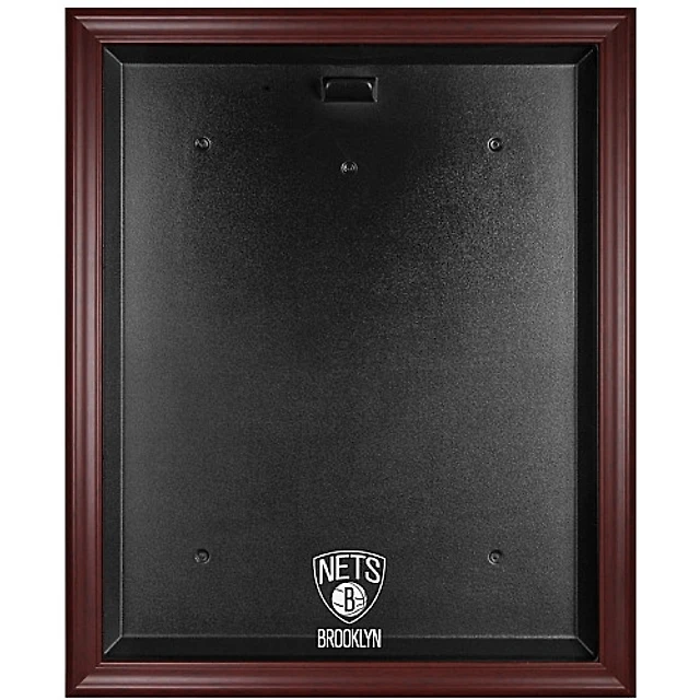 Vitrine de présentation du maillot avec logo encadré en acajou des Brooklyn Nets