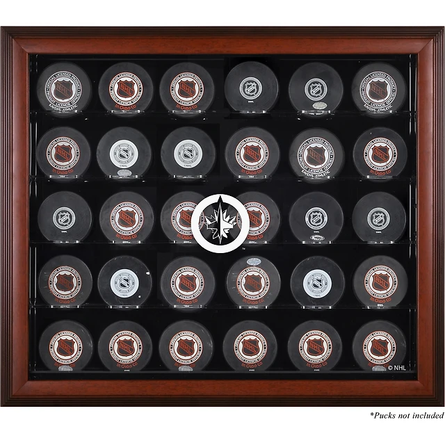 Vitrine de présentation encadrée en acajou avec 30 logos de rondelles de hockey des Jets de Winnipeg