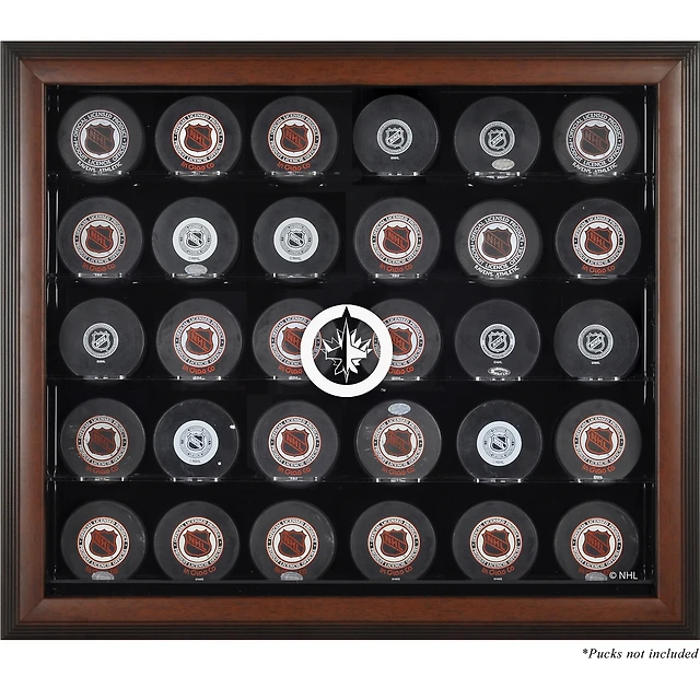 Vitrine de présentation encadrée marron avec 30 logos de rondelles de hockey des Jets de Winnipeg
