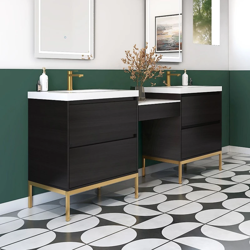 A double vanity set seamlessly joined by a central makeup cabinet, blending sleek laminate finishes, modern basins, and metal leg support. With soft-close drawers, full-extension access, and integrated organizers, it offers a perfect balance of styl