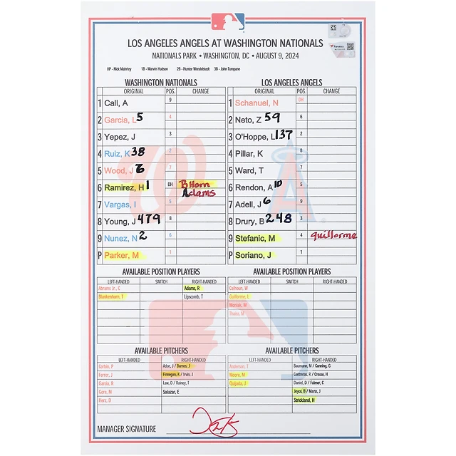 Washington Nationals Game-Used Lineup Card vs. Los Angeles Angels on August 9, 2024