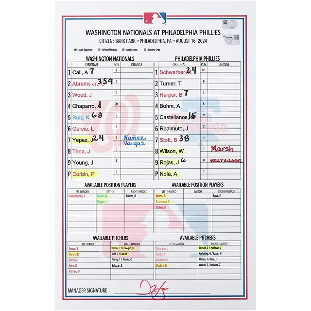 Washington Nationals Game-Used Lineup Card vs. Philadelphia Phillies on August 16, 2024