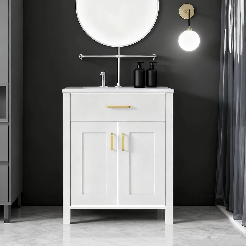 Enhance your small bathroom with this 24-inch vanity set featuring a sleek white finish and a durable ceramic sink. Built with a solid wood frame and MDF panels, it offers lasting stability and elegance. Two soft-close doors with gold handles reveal