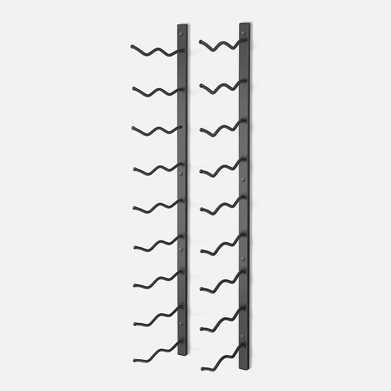 Mount up to 18 bottles right on your wall in the kitchen, dining room or bar. The slim profile design is highly space saving and simplistic enough for any room. The sturdy wrought iron construction supports the bottles firmly and the whole thing is
